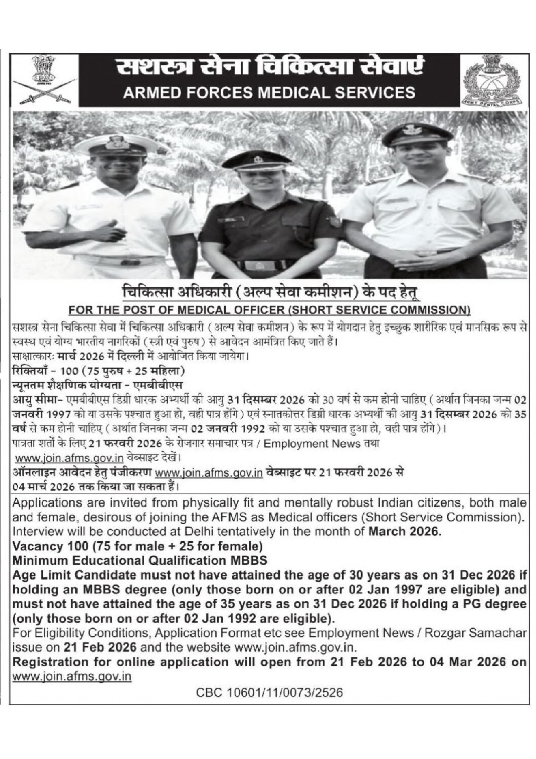 AFMS SSC Medical Officer Recruitment 2026 लिंक पर क्लिक करें।