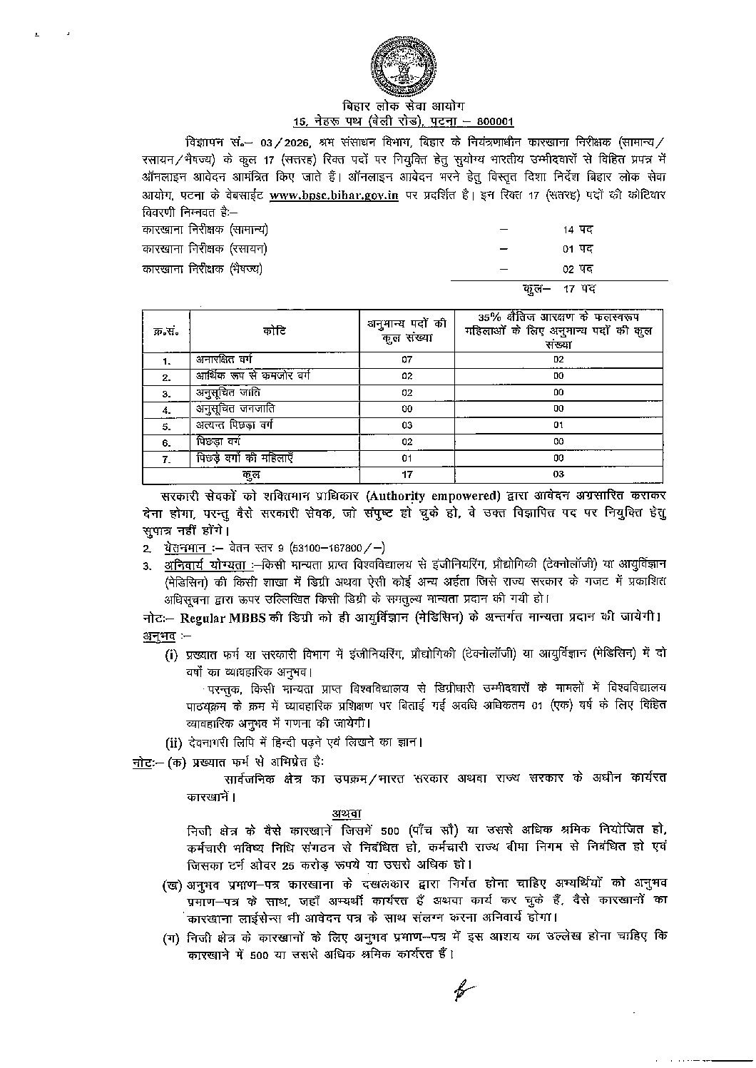 Bihar Public Service Commission (BPSC) ने Factory Inspector Recruitment 2026 के लिए official notification जारी कर दिया है। इस भर्ती के अंतर्गत कुल 17 पदों पर नियुक्ति की जाएगी। Eligible candidates 12 January 2026 से 02 February 2026 तक online आवेदन कर सकते हैं।